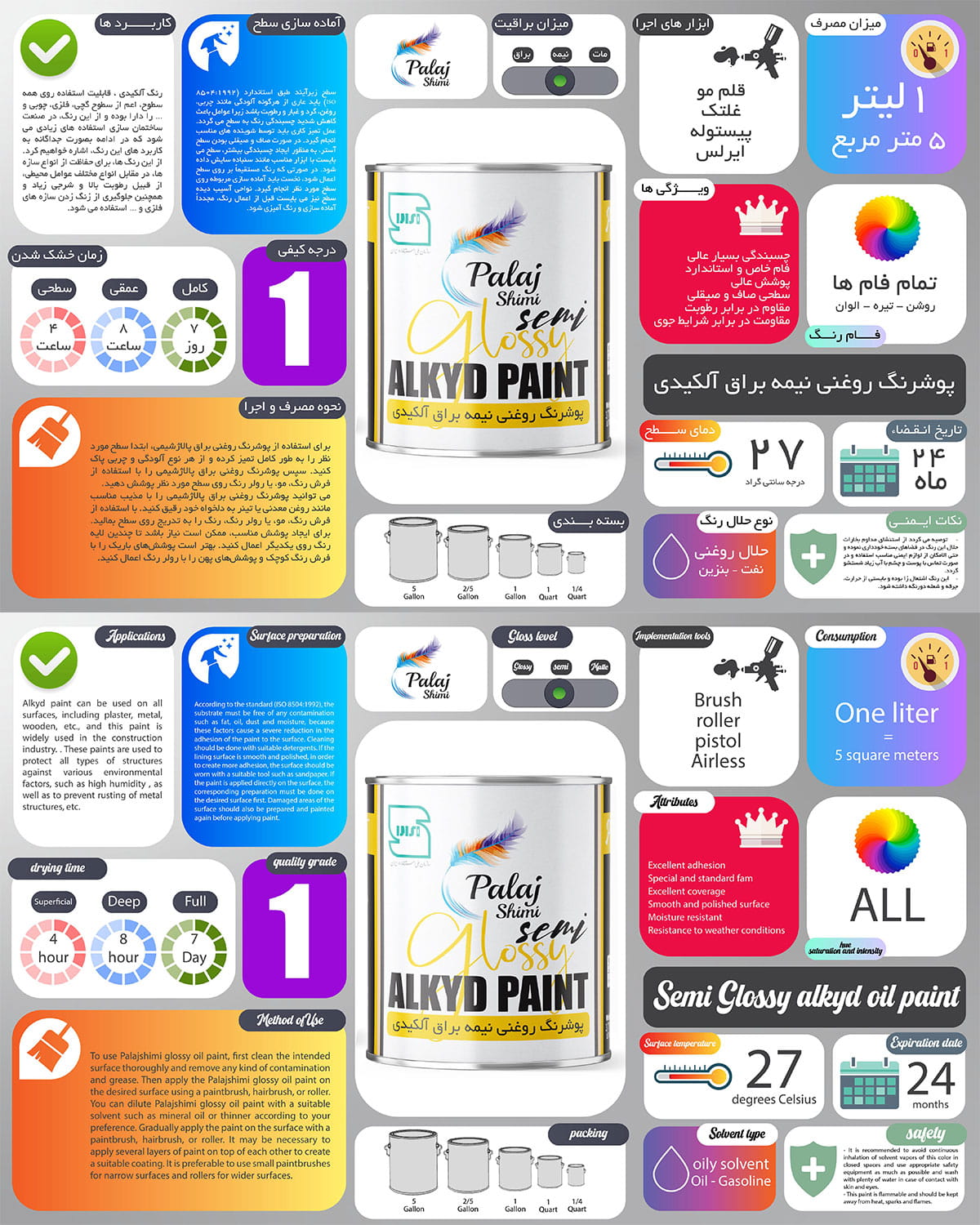رنگ روغنی نیمبراق پالاژ شیمی با بهرهگیری از رزینهای روغنی باکیفیت، ترکیبی متعادل از جلوه ظاهری مناسب و عملکرد فنی قابل اتکا ارائه میدهد. این محصول با ایجاد درخشندگی ملایم، سطحی صاف و خوشنما ایجاد کرده و نسبت به رنگهای مات، مقاومت بیشتری در برابر آلودگی و شستشو دارد.
